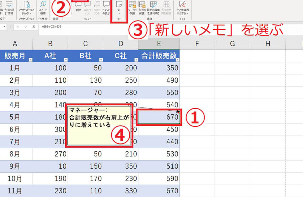 Excelシートで印刷したいコメント(メモ)がある場合、まずそれらを表示する必要があります。コメントはセルに関連付けられており、通常はセルにマウスを移動すると表示されます。
