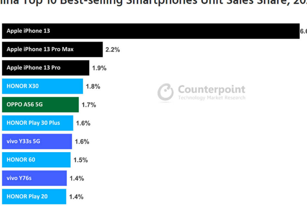 【なぜ?】2022年中国で最も売れたスマホはiPhone13 – 国内メーカー抑え圧倒的人気